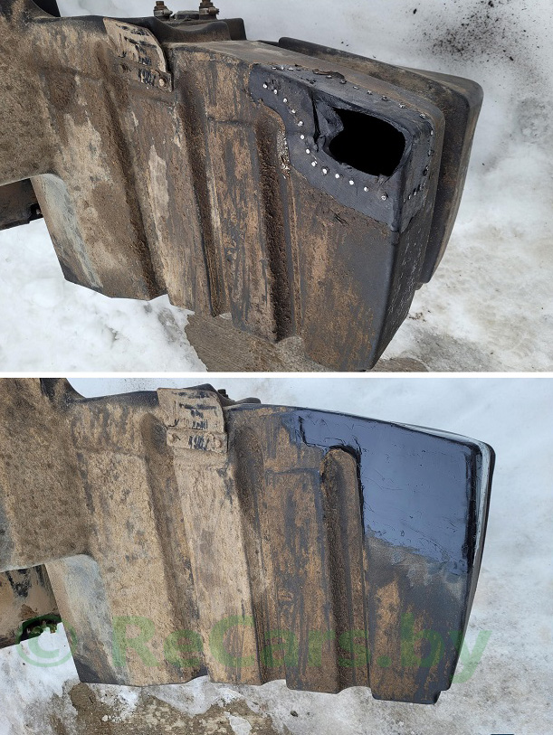 - Mercedes Actros — пример ремонта сквозного отверстия в пластиковом топливном баке: